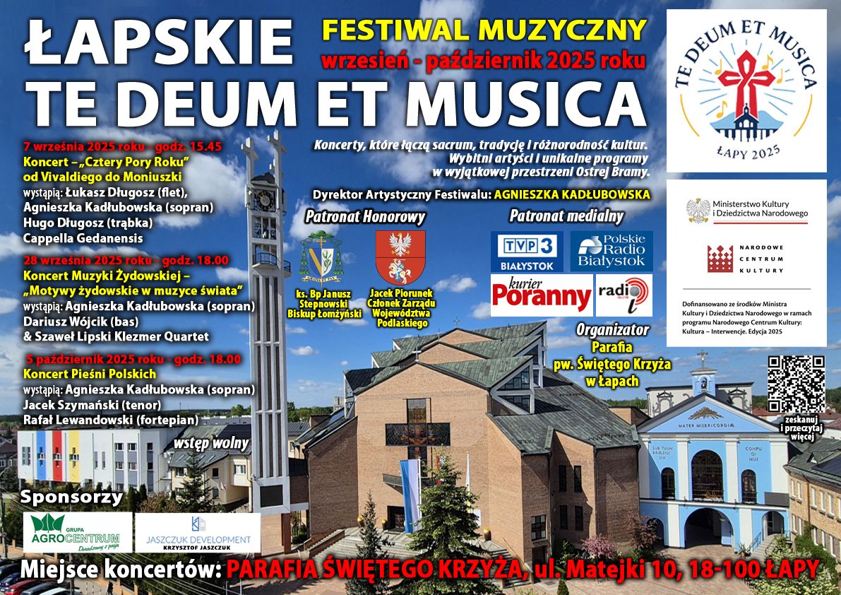 Wrzesień i październik 2025 roku będą w Parafii pw. Świętego Krzyża w Łapach czasem wyjątkowych spotkań z muzyką. W ramach Festiwalu „Łapskie Te Deum et Musica” odbędą się trzy koncerty ukazujące bogactwo różnych stylów – od arcydzieł sakralnych i klasycznych, poprzez muzykę żydowską, aż po polskie pieśni. Wszystkie koncerty odbędą się w przestrzeni parafii, gdzie obok świątyni znajduje się wierna kopia wileńskiej Kaplicy MB Ostrobramskiej – duchowe serce naszego festiwalu.