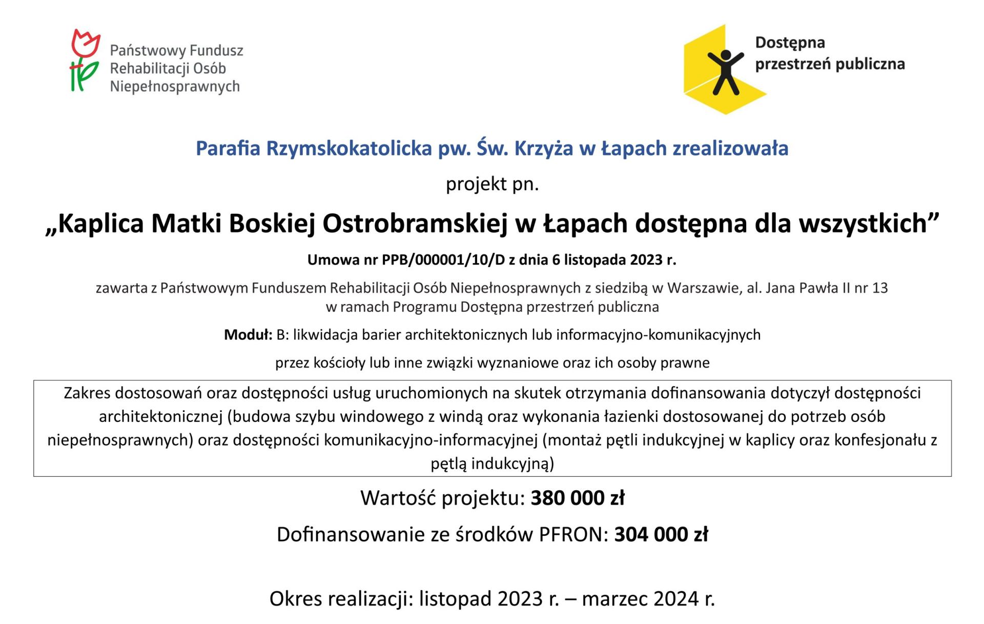Celem projektu było zapewnienie osobom niepełnosprawnym, m.in. z naruszoną sprawnością słuchu, wzroku, fizyczną oraz intelektualną, dostępu do przestrzeni publicznej kościoła katolickiego poprzez dostosowanie do ich potrzeb nowopowstałej Kaplicy Matki Boskiej Ostrobramskiej w Łapach przy Parafii pw. Św. Krzyża. W ten sposób osoby niepełnosprawne mogą brać pełny udział w życiu społecznym Parafii, a ich potrzeby są w pełni wzięte pod uwagę.